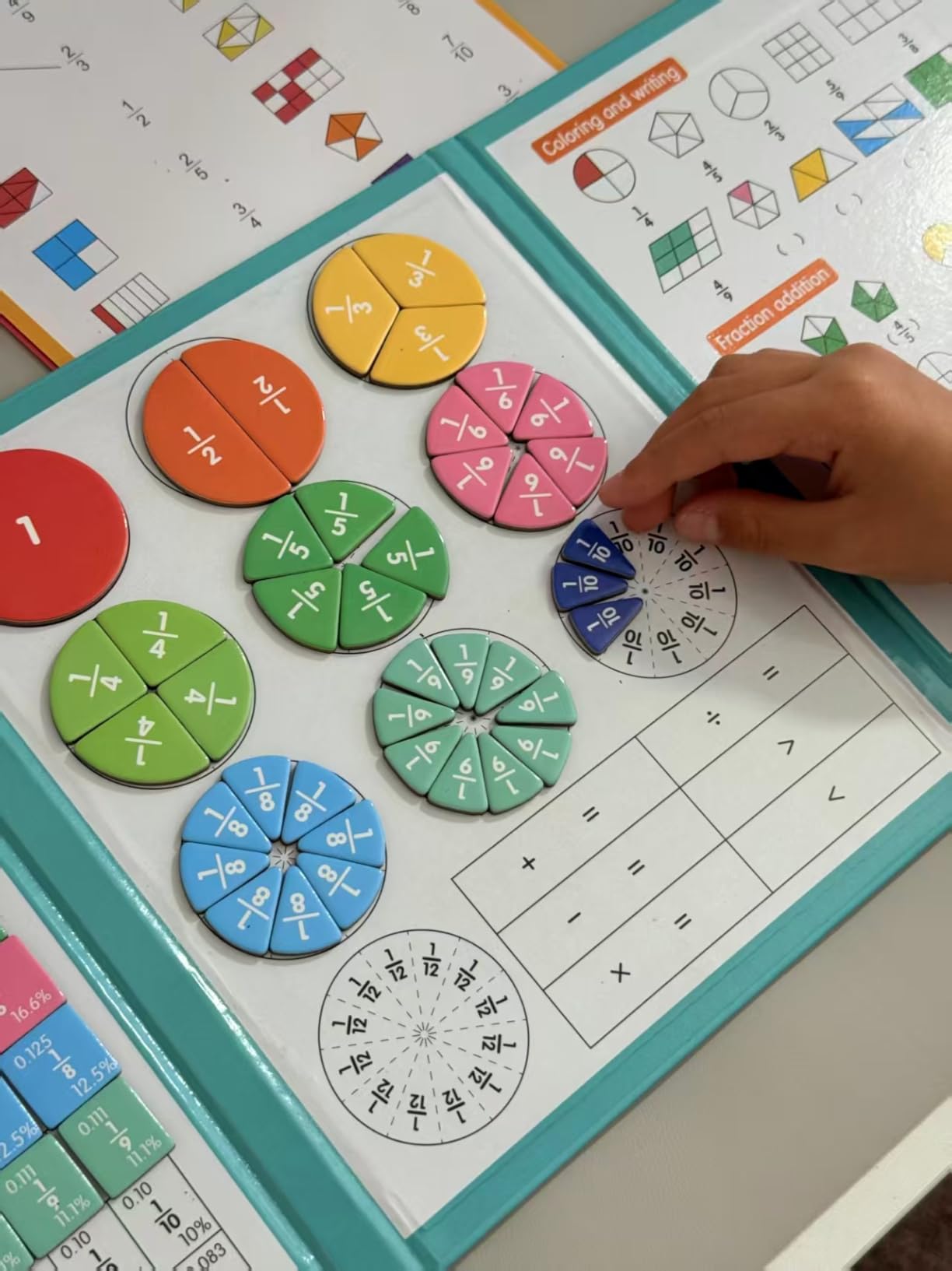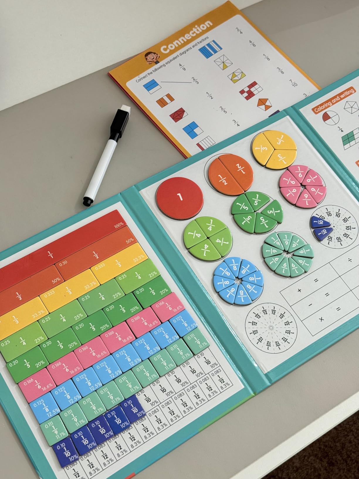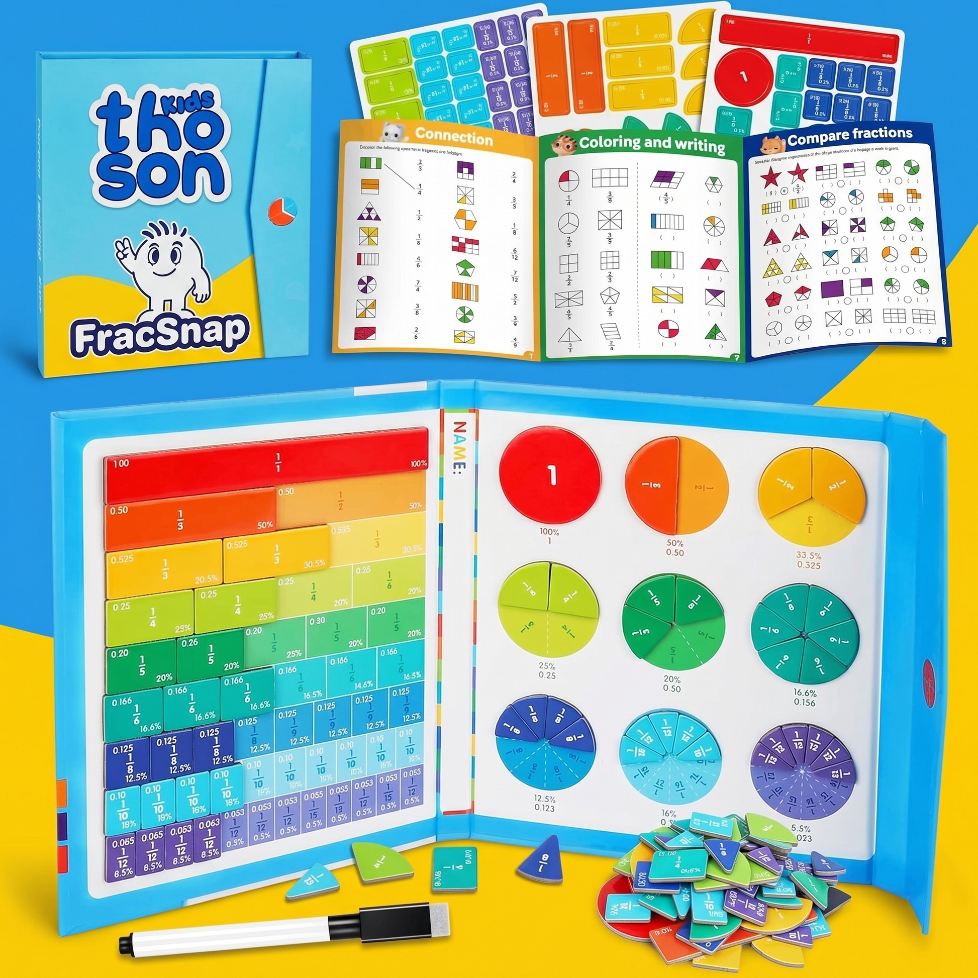 Thoson FracSnap is a magnetic fraction book where kids place color-coded pieces onto a board to see how parts make a whole. No worksheets. No apps. They pick up a piece, snap it on, and watch fractions click. Literally and mentally.